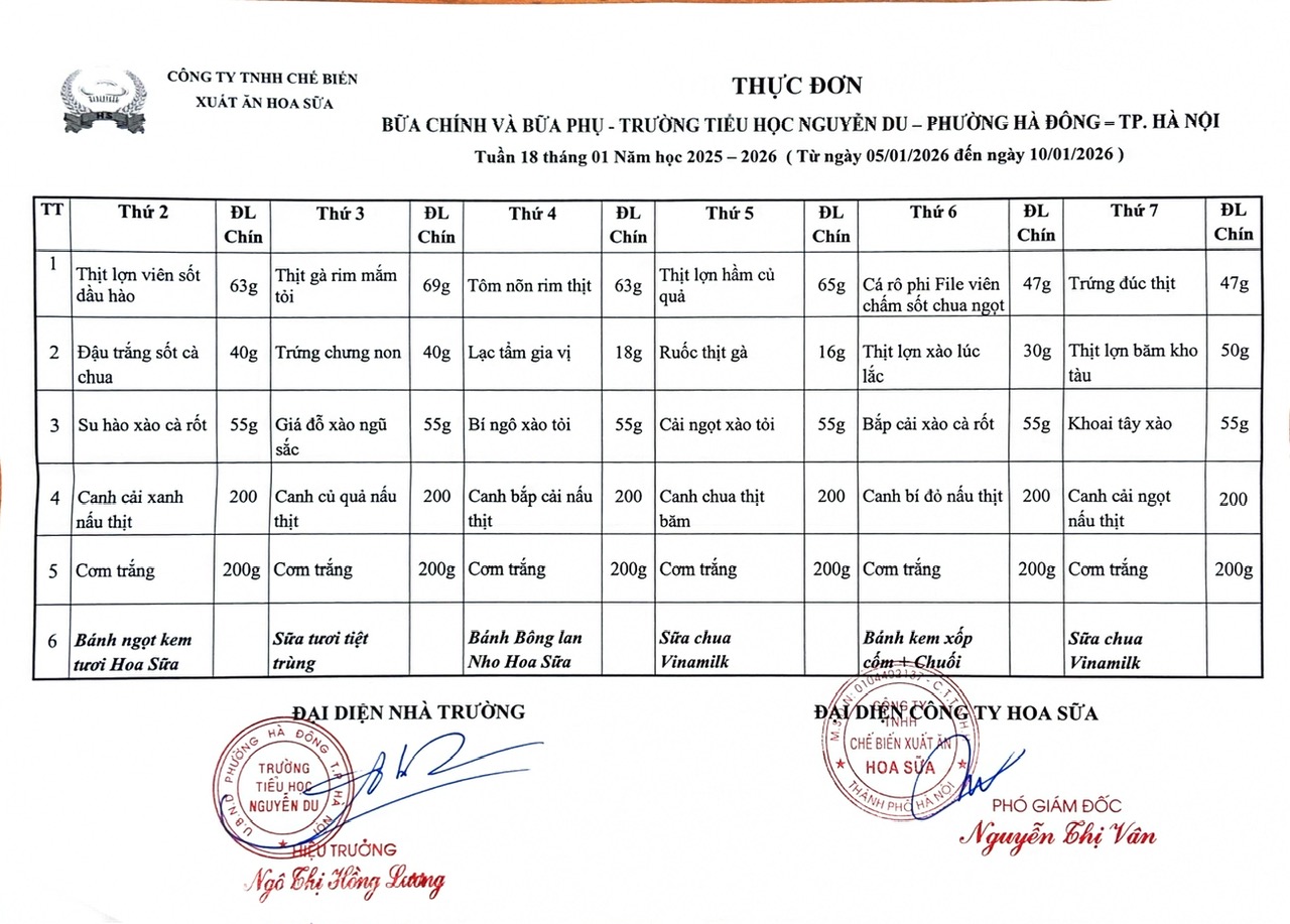 Thực đơn bữa chính và bữa phụ Tuần 18 tháng 01 năm 2026