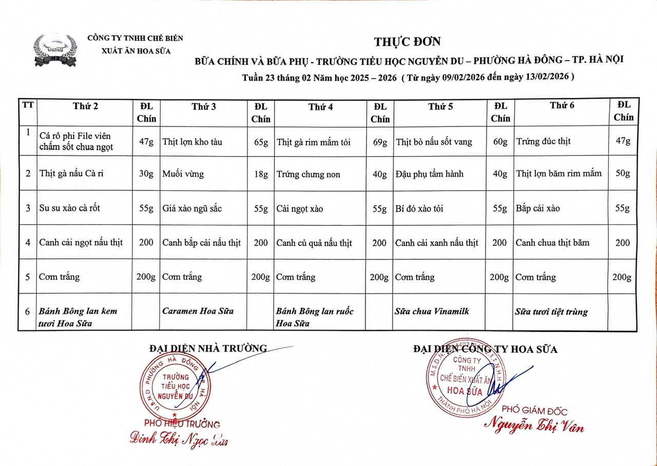Thực đơn bữa chính và bữa phụ Tuần 23 tháng 02 năm 2026
