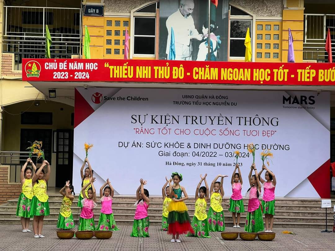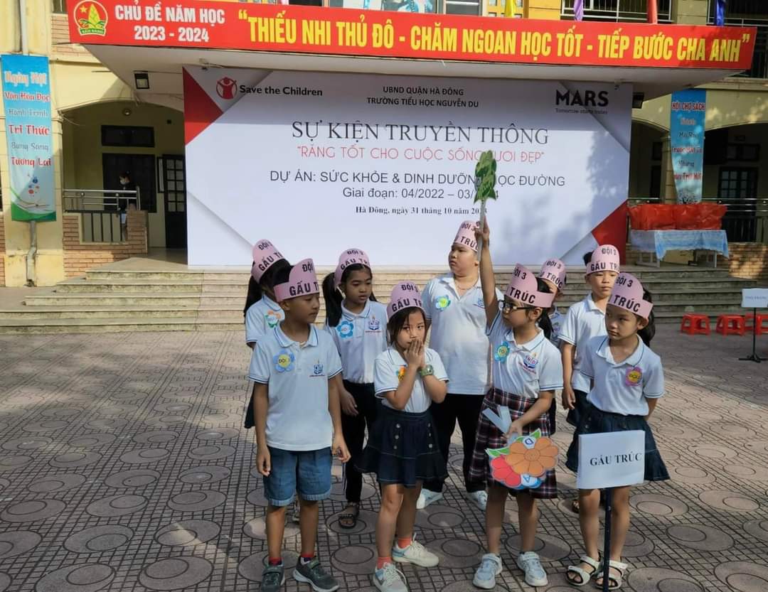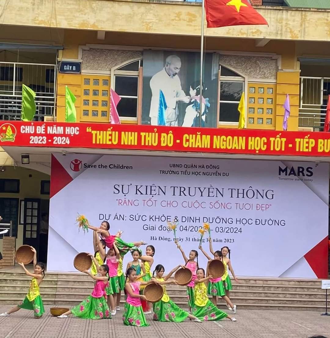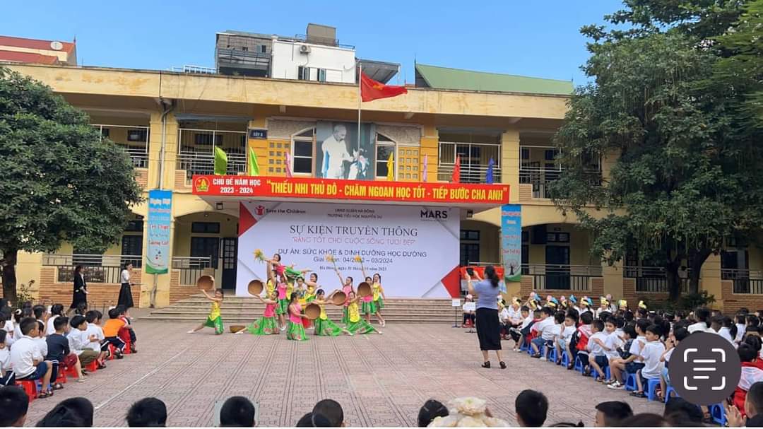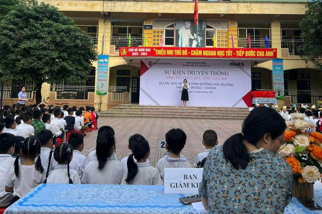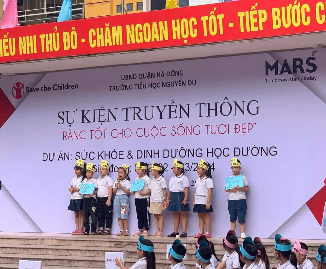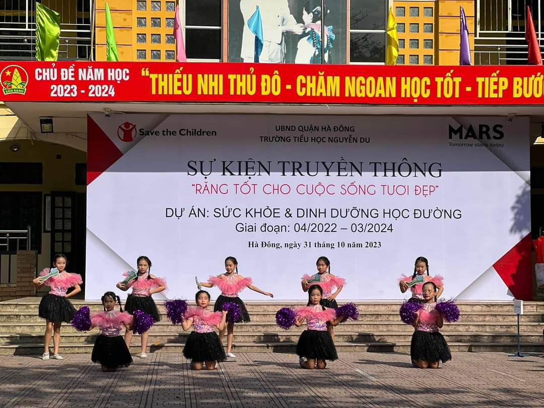 Sáng ngày 31/10/2023, trường Tiểu học Nguyễn Du đã tổ chức thành công Chương trình truyền thông sức khoẻ và dinh dưỡng học đường với Chủ đề: “Răng tốt cho cuộc sống tươi đẹp”. Tham dự sự kiện có các cô giáo trong Ban giám hiệu nhà trường, các thầy cô trong hội đồng sư phạm nhà trường, đặc biệt sự có mặt của hơn 400 em học sinh của khối lớp 2. BTC đã truyền thông bằng hình thức sân khấu hóa với 3 đội tham gia thi là “Thỏ Trắng”, “Sóc Nâu” và “Gấu Trúc”. Ba đội trải qua 3 phần chơi “Phần thi chào hỏi”, “Phần thi trả lời câu hỏi trắc nghiệm” và “Trả lời nhanh”, cùng phần thi giao lưu khán giả đã mang đến cho các con nhiều hứng khởi và vô cùng thích thú. Qua buổi truyền thông học sinh đã nhận thức được việc chăm sóc sức khỏe răng miệng đúng cách, giúp các em hiểu được tầm quan trọng của vệ sinh cá nhân đối với sức khỏe bản thân. Chúc cho các em luôn có hàm răng chắc khỏe với nụ cười tự tin tỏa nắng.