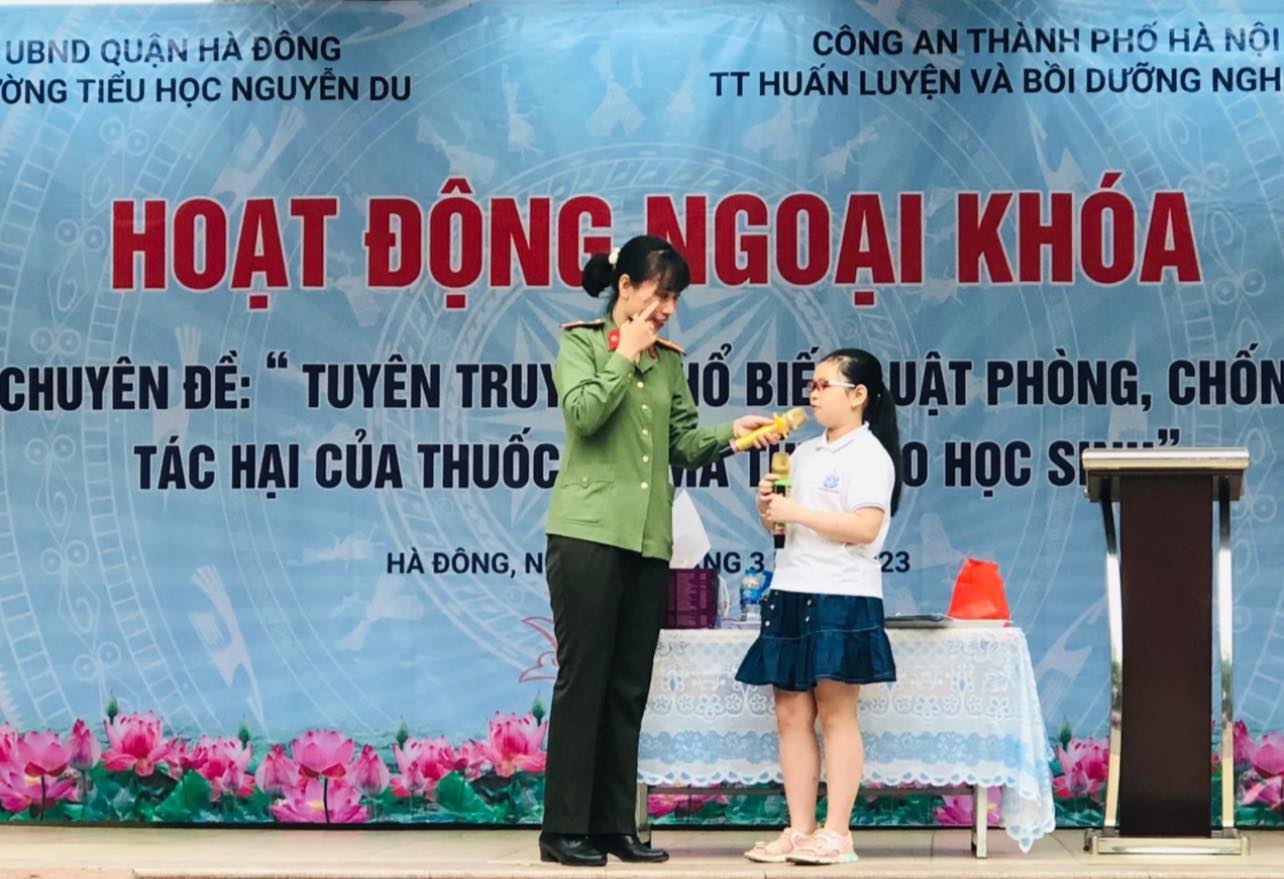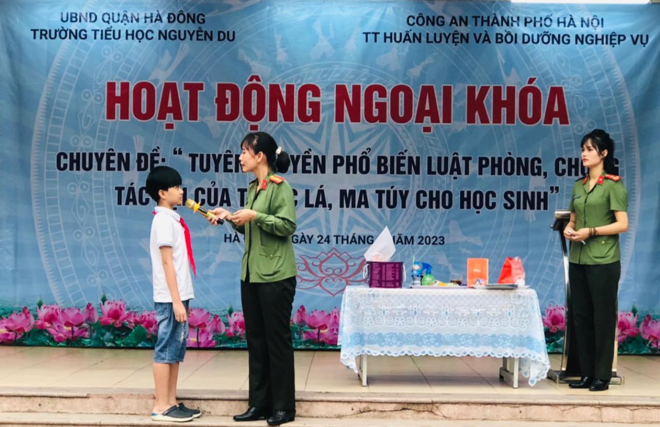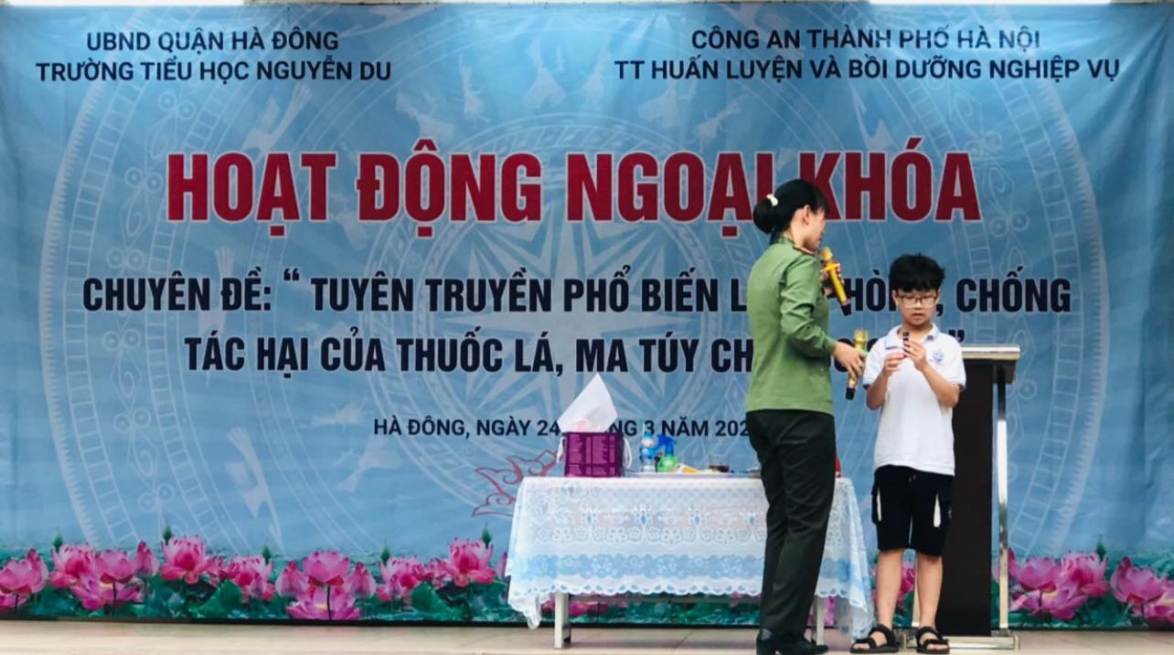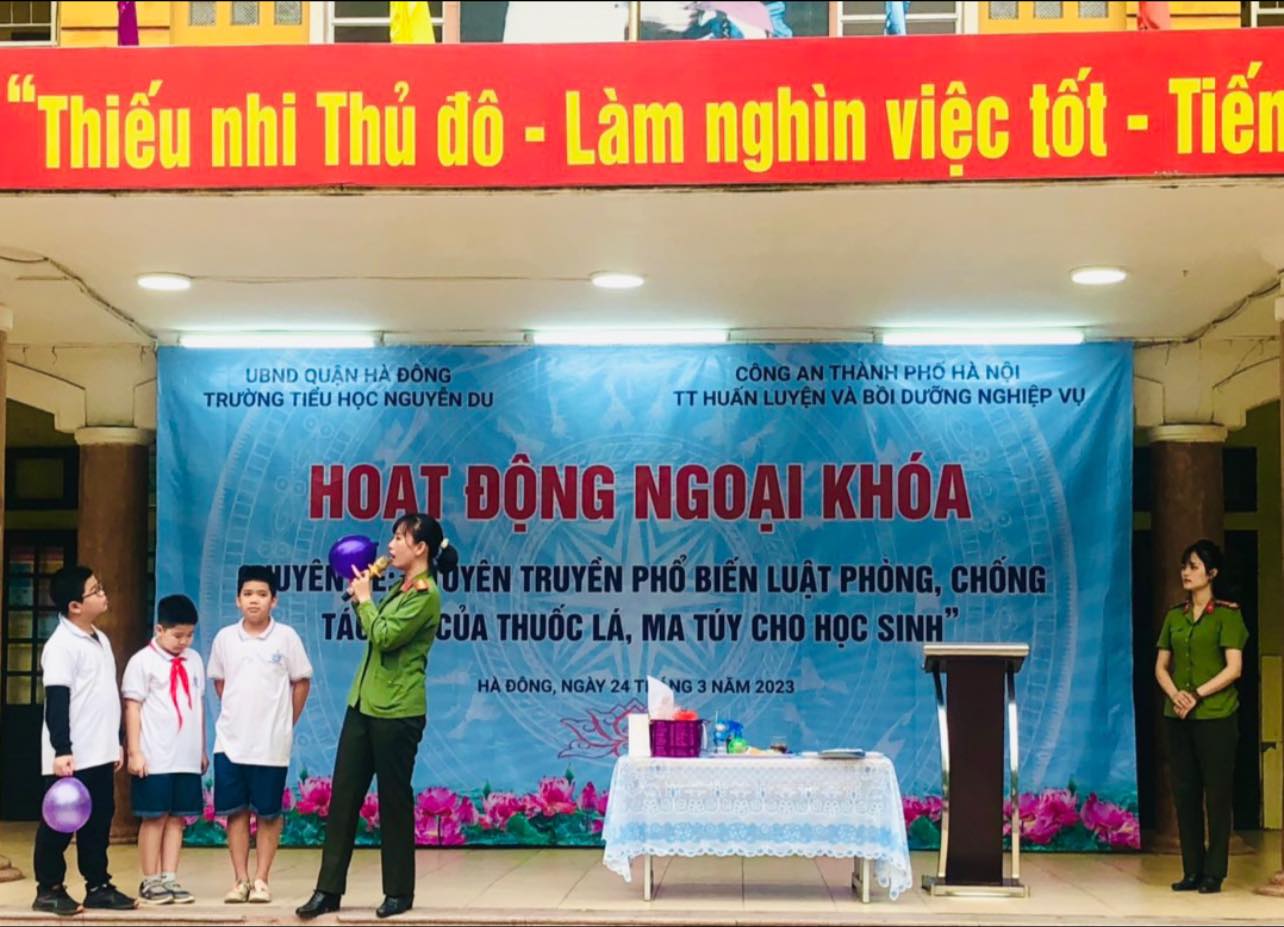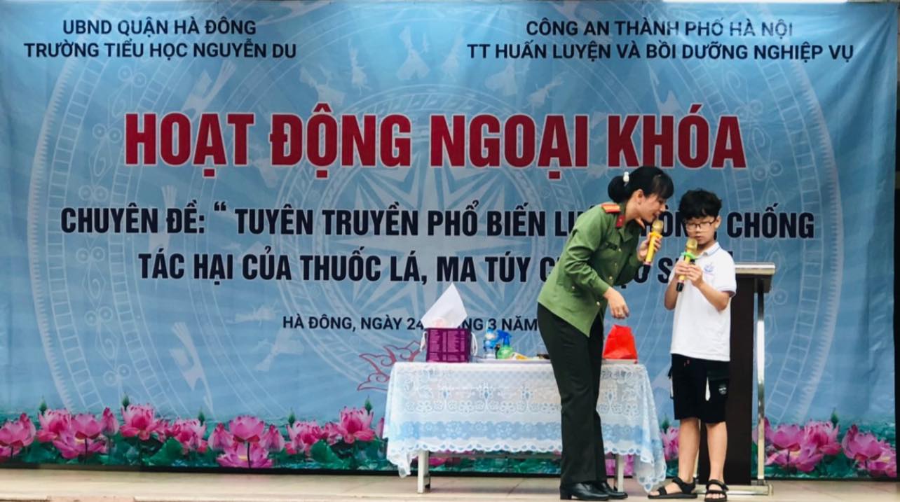 Sáng ngày 24/3 trường tiểu học Nguyễn Du phối hợp với Trung tâm huấn luyện và bồi dưỡng nghiệp vụ công an thành phố Hà Nội tổ chức buổi ngoại khóa “Tuyên truyền phổ biến Luật phòng, chống tác hại của ma túy, thuốc lá cho học sinh”.