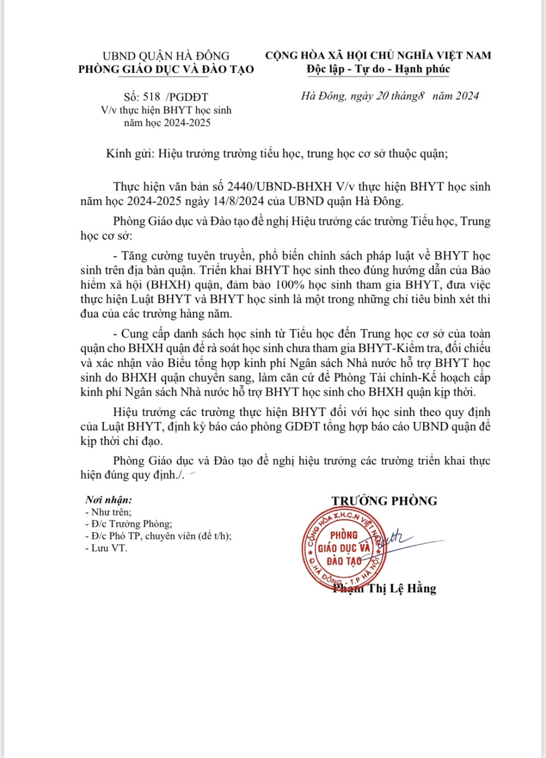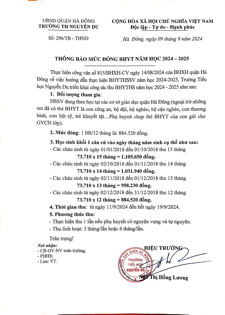 Công văn số 518/PGDĐT ngày 20/8/2024 của phòng GDĐT quận Hà Đông về việc thực hiện BHYT học sinh năm học 2024-2025; Thông báo mức đóng BHYT năm học 2024-2025 của trường TH Nguyễn Du.