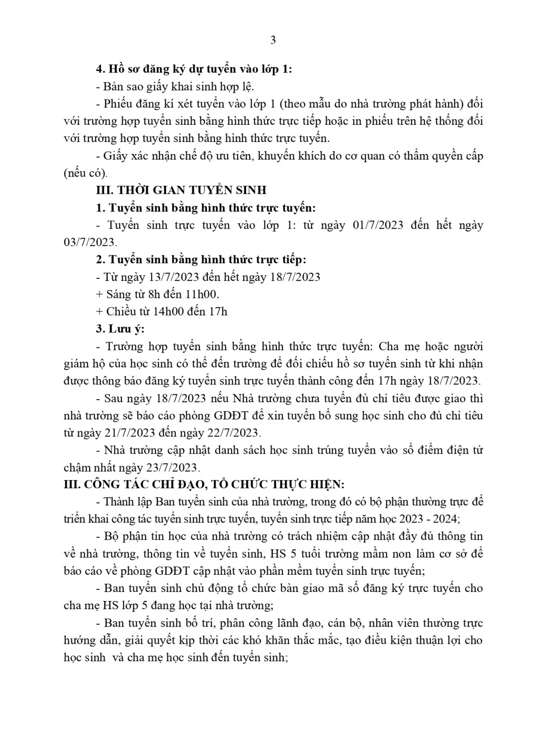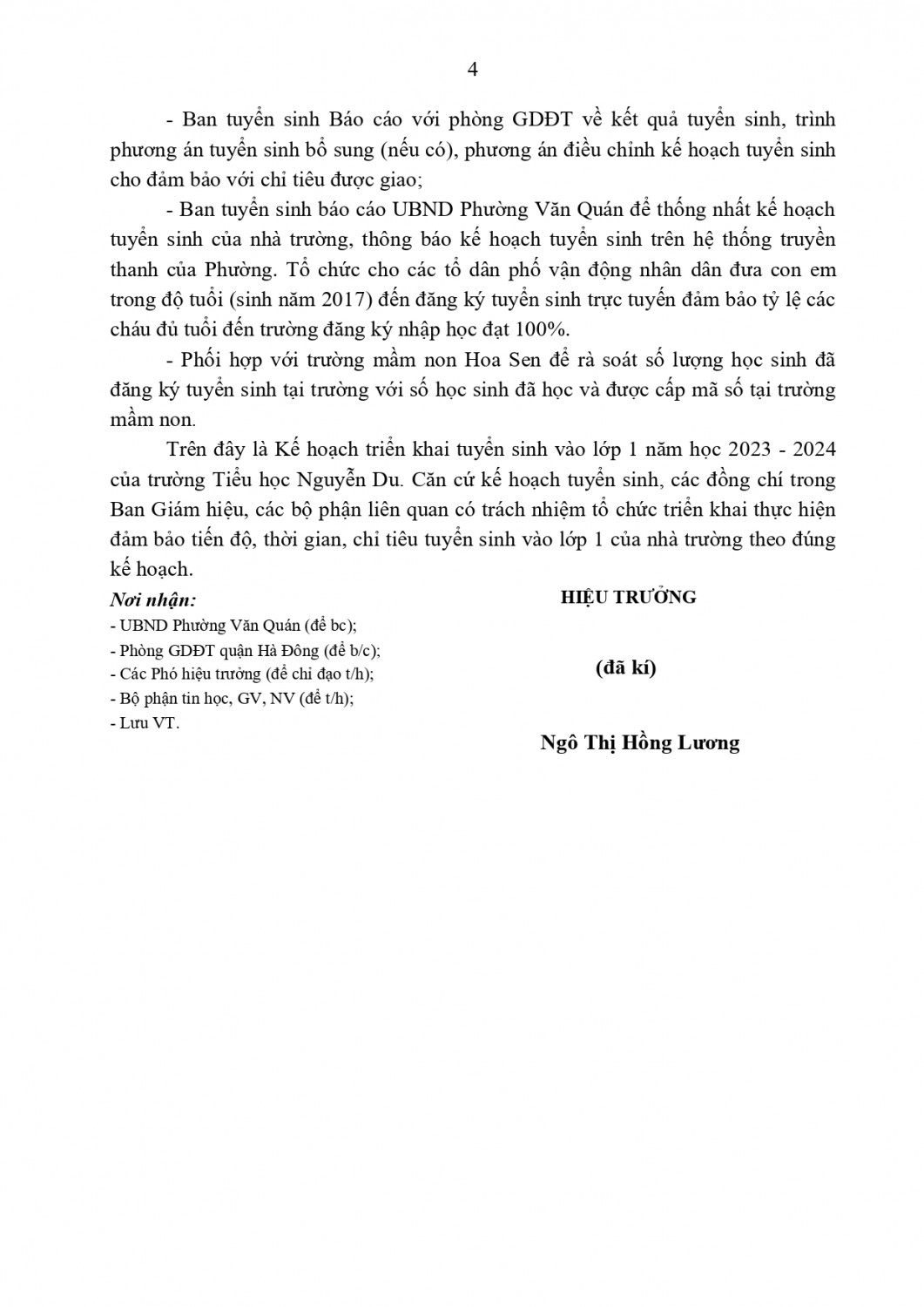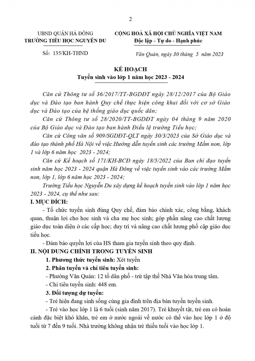 KẾ HOẠCH TUYỂN SINH VÀO LỚP 1 TRƯỜNG NGUYỄN DU NĂM HỌC 2023-2024