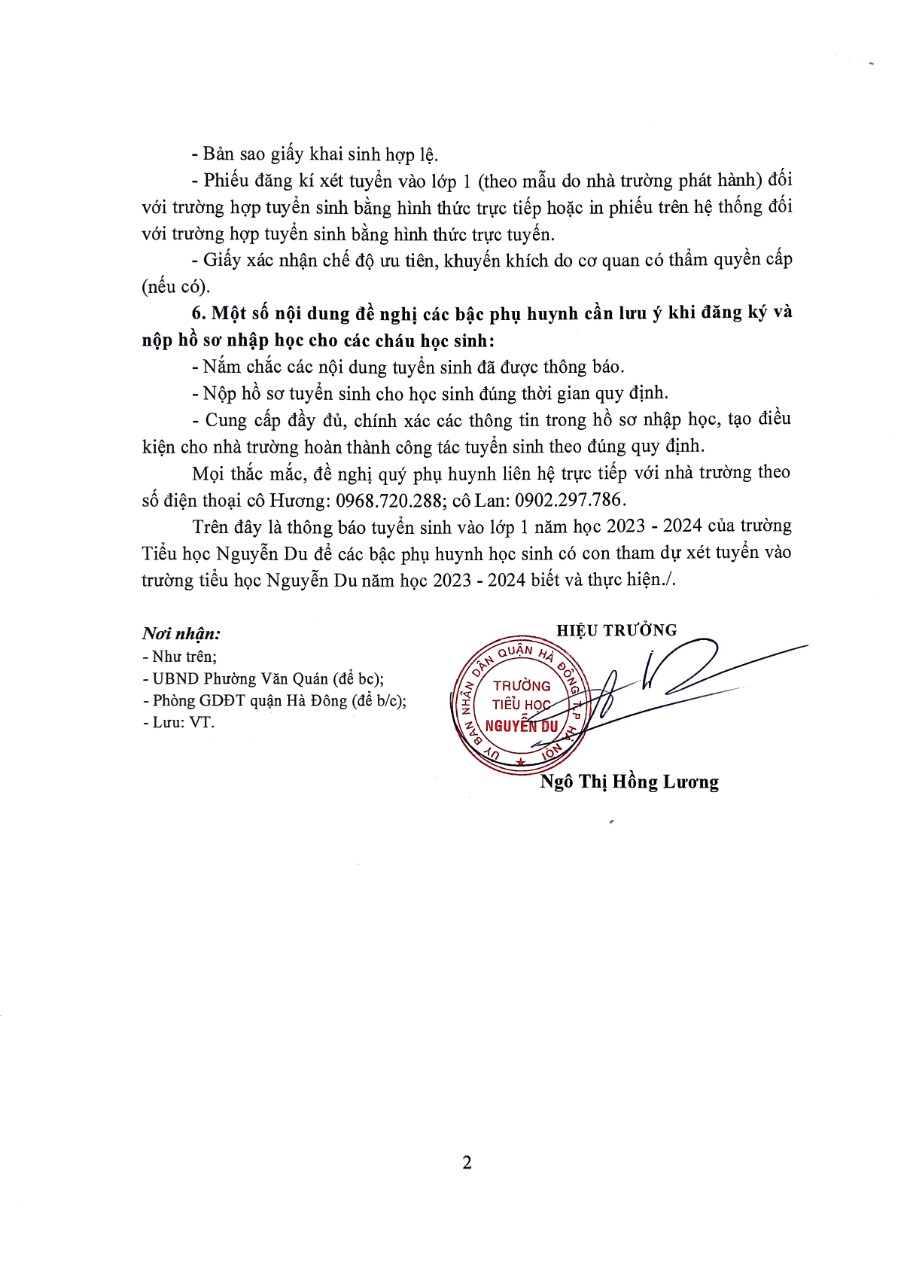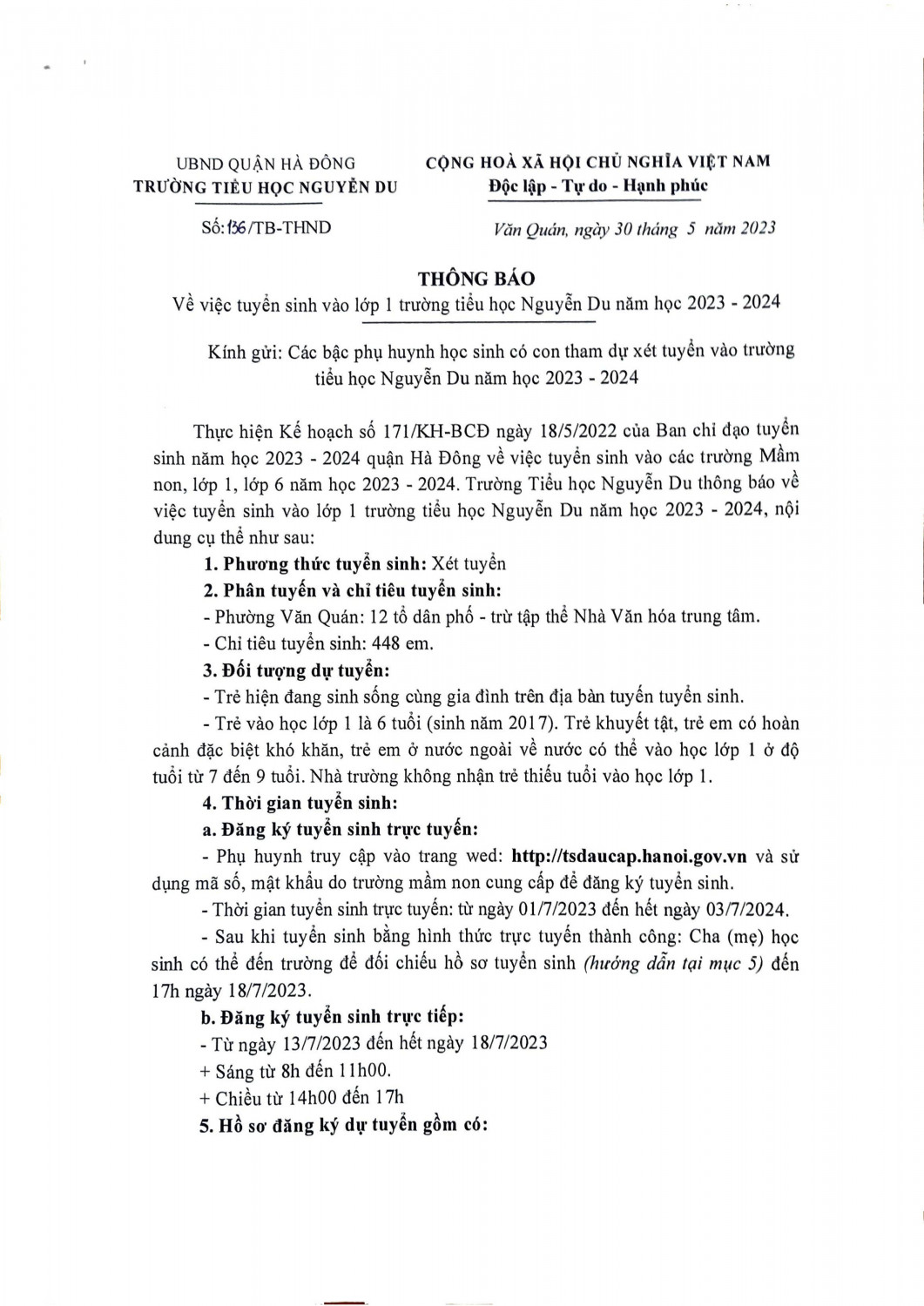 THÔNG BÁO TUYỂN SINH VÀO LỚP 1 TRƯỜNG TIỂU HỌC NGUYỄN DU NĂM HỌC 2023-2024