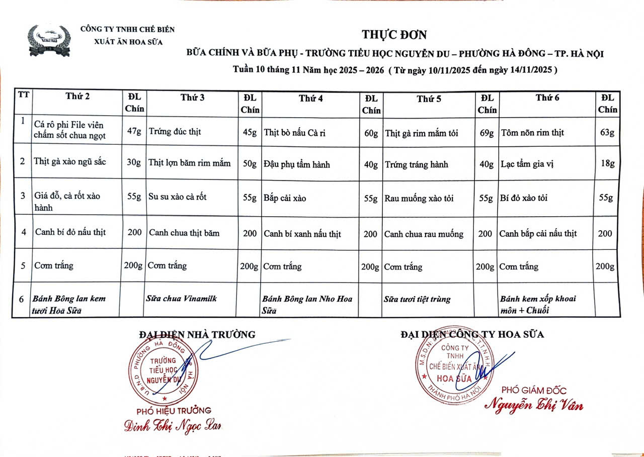 Thực đơn bữa chính, bữa phụ Tuần 10 tháng 11