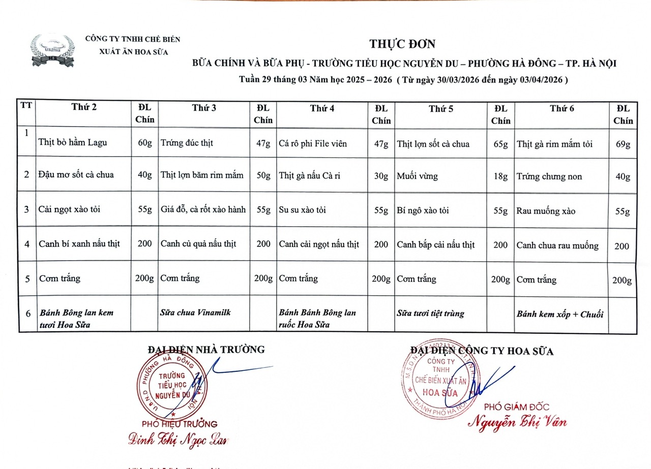 Thực đơn bữa chính và bữa phụ Tuần 29 tháng 3 năm 2026