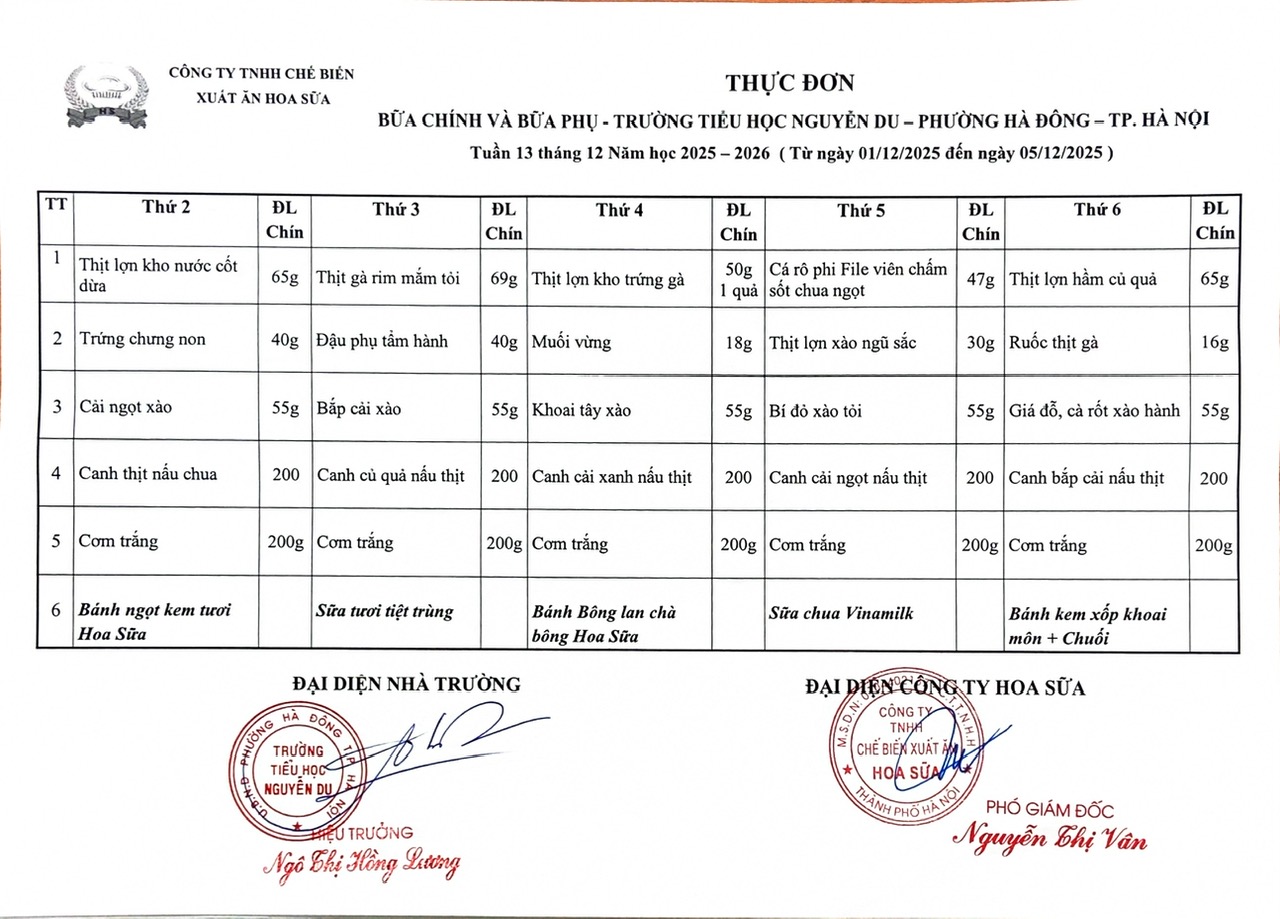 Thực đơn bữa chính và bữa phụ Tuần 13