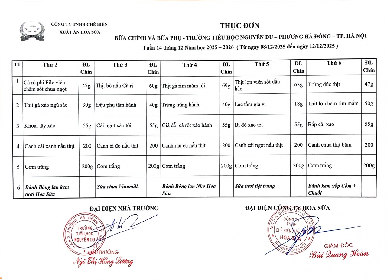 Thực đơn bữa chính và bữa phụ Tuần 14 tháng 12
