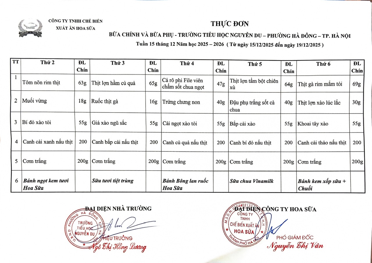Thực đơn bữa chính và bữa phụ Tuần 15 tháng 12