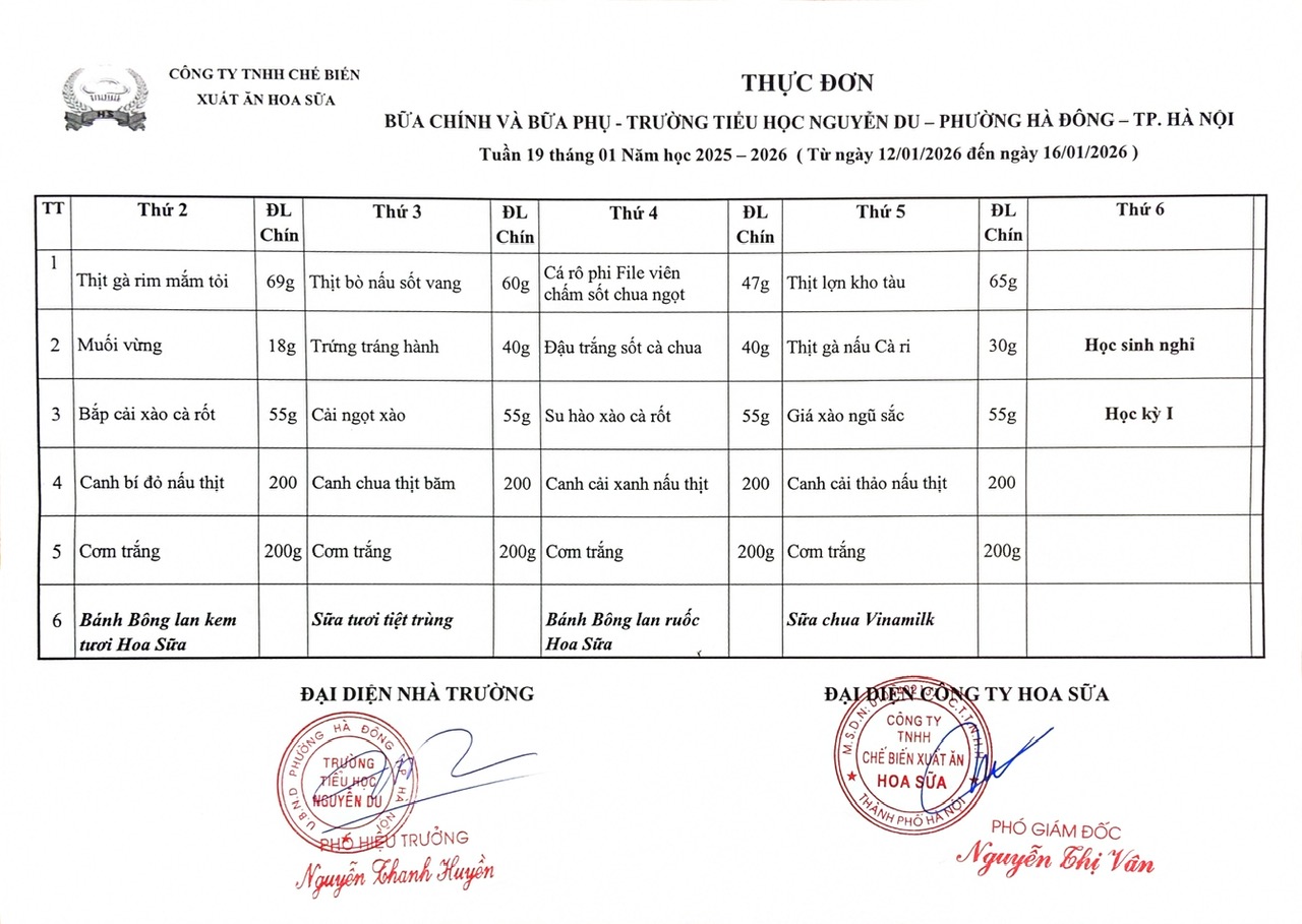 Thực đơn bữa chính và bữa phụ Tuần 19 tháng 01 năm 2026