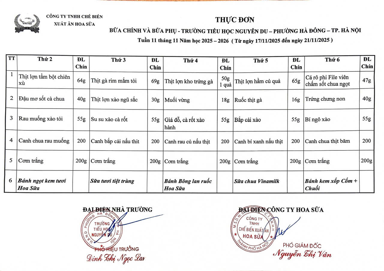 Thực đơn bữa chính và bữa phụ tuần 11 tháng 11