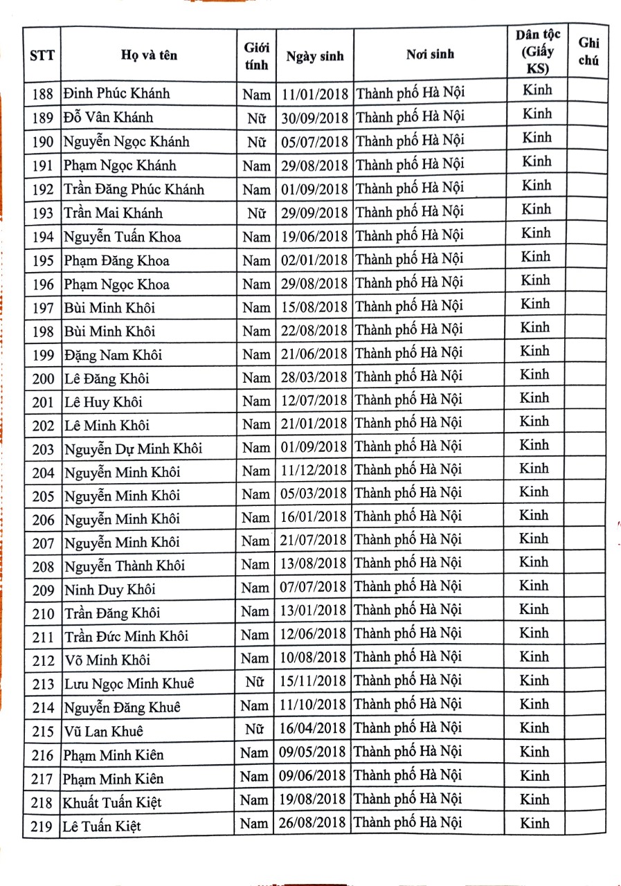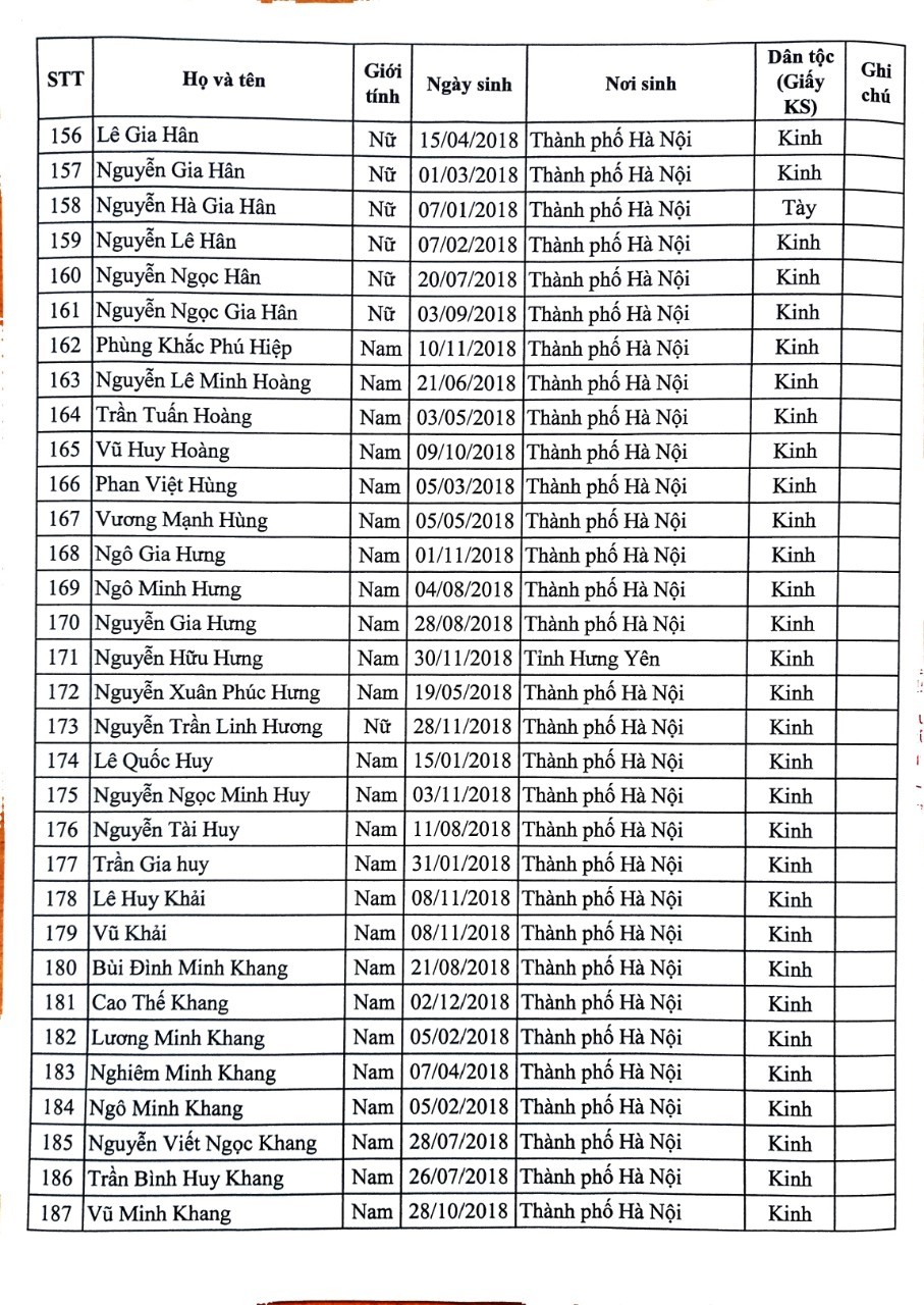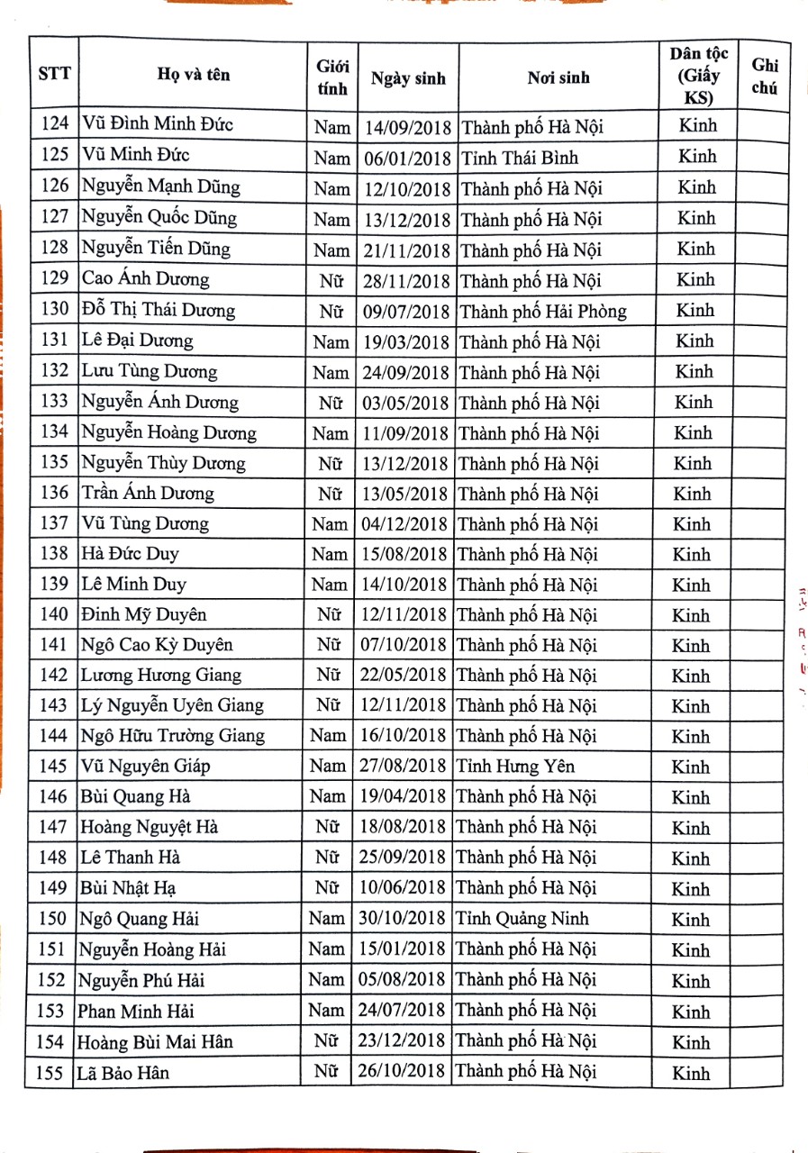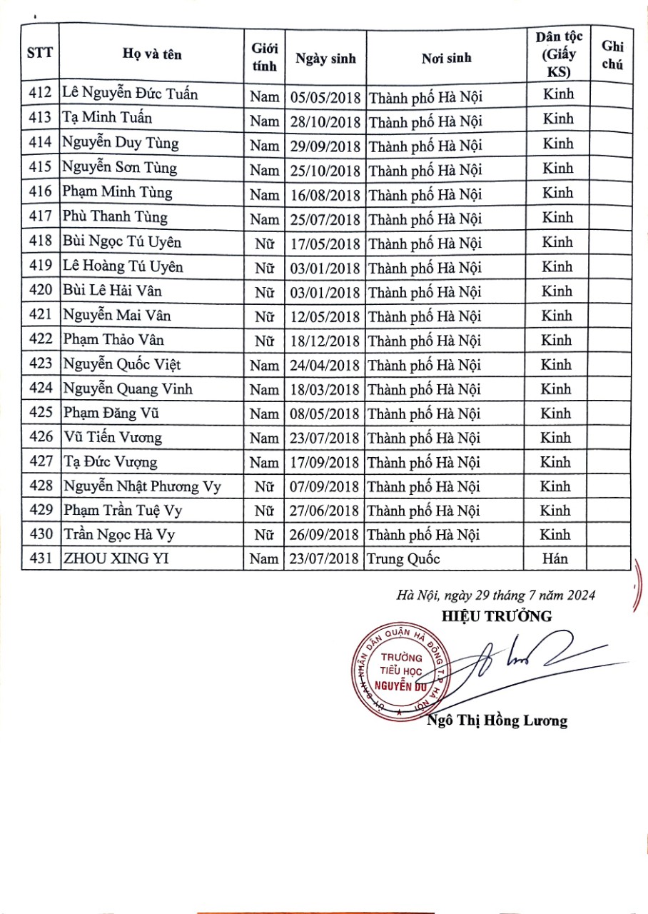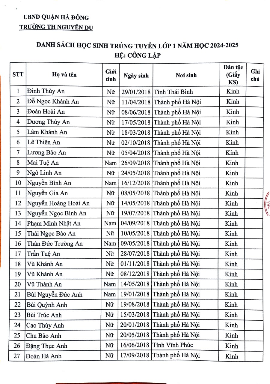 Danh sách học sinh trúng tuyển lớp 1 năm học 2024-2025 trường Tiểu học Nguyễn Du - Hà Đông: